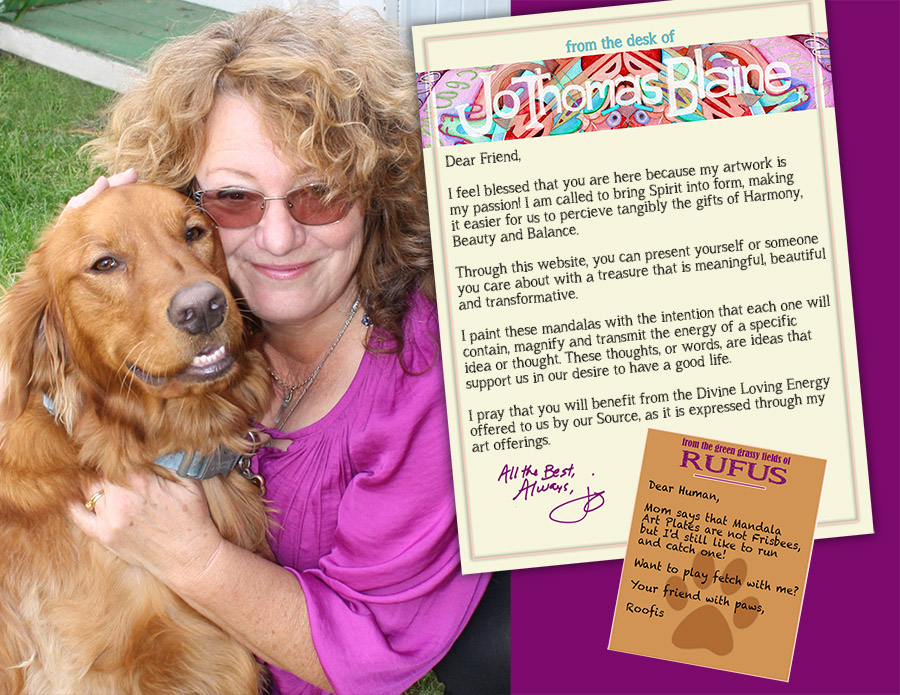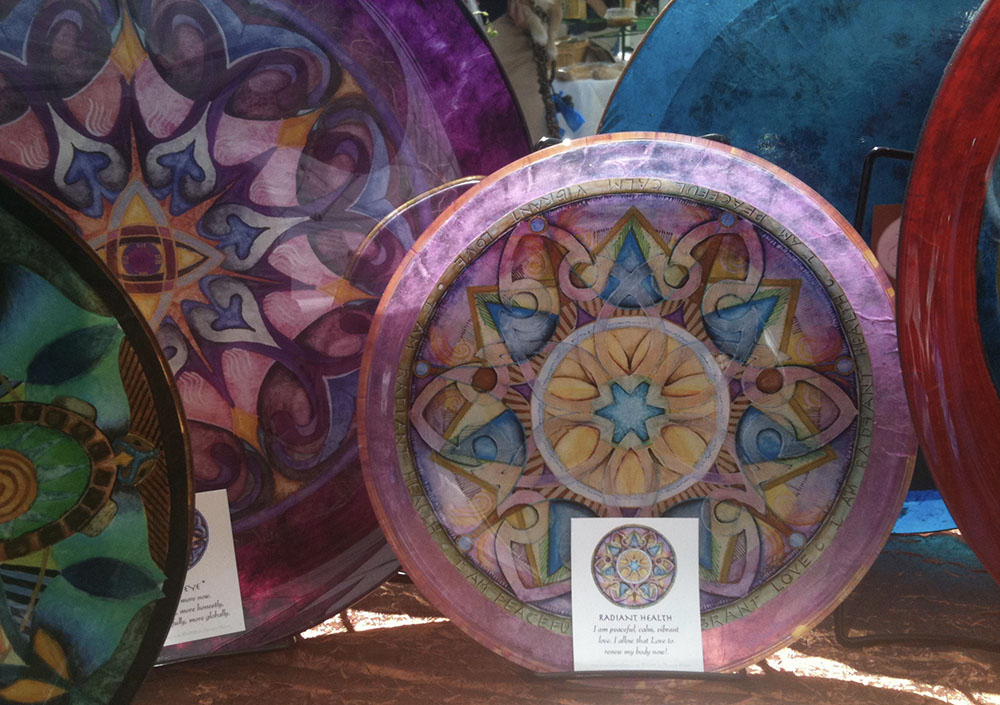Welcome to a world of exquisite, contemporary mandala images in watercolor, springing from the heart, soul and hands of Jo Thomas Blaine, reproduced and partnered with clear glass plates to produce functional art at its finest. Scroll down here for some samples. Over 60 different original paintings are offered as plates, bowls, pendants, tiles, earrings, limited edition matted prints, greeting cards and more.