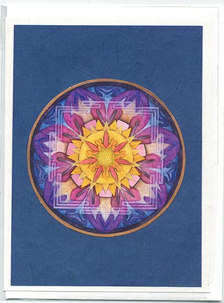 A brilliant, glossy print of the mandala is layered on top of exotic, handmade paper.