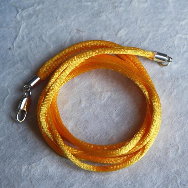 A 19 inch double strand of soft, satin cord, with silver plated end caps and lobster clasp.