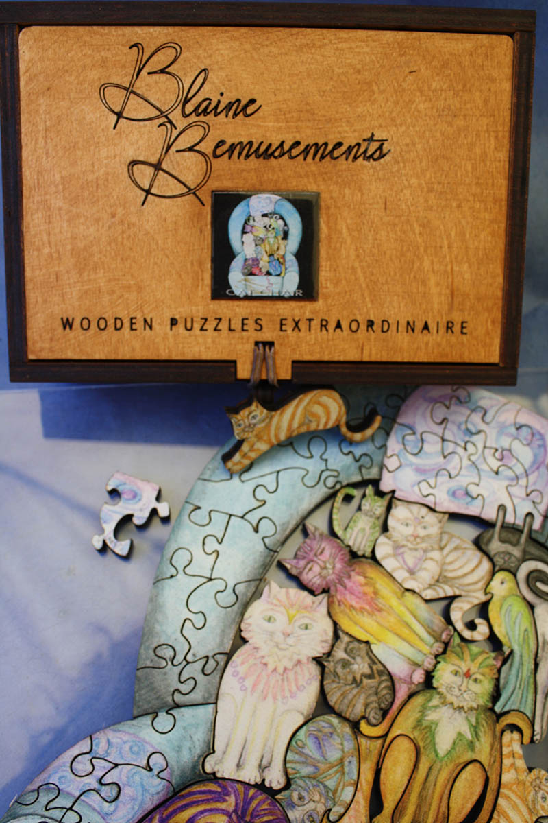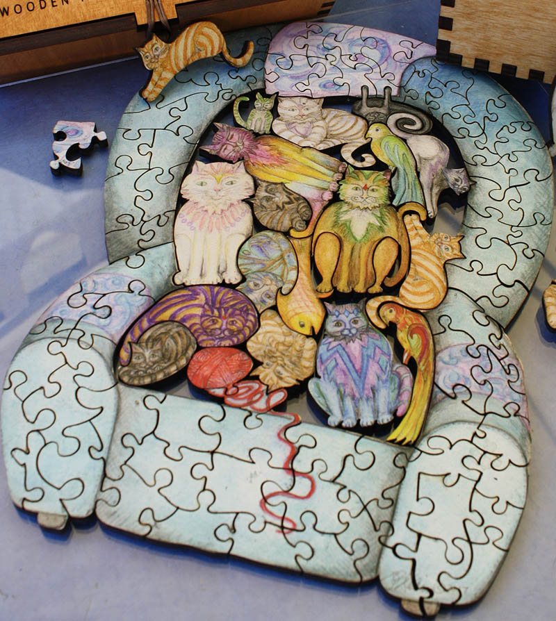 How many cats can fit on your favorite chair? Quite a few, if you are the one who has just come seeking a nice place to read! Cat lovers will adore this, and if you are not sure they love to build puzzles, get it for them pre-built in the display frame (from which the puzzle is removable,) for they will surely love looking at this. The Cat Chair puzzle is carved from 1/4″ baltic birch plywood, and printed with archival, UV safe inks. It measures about 8″x 11″ and contains 92 pieces.