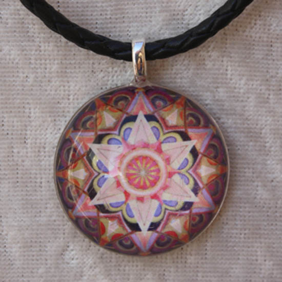 The $18, 30mm silver plated resin-back pendant, with the mandala’s name on the back is pictured here. The cord is sold separately in Miscellaneous Items.