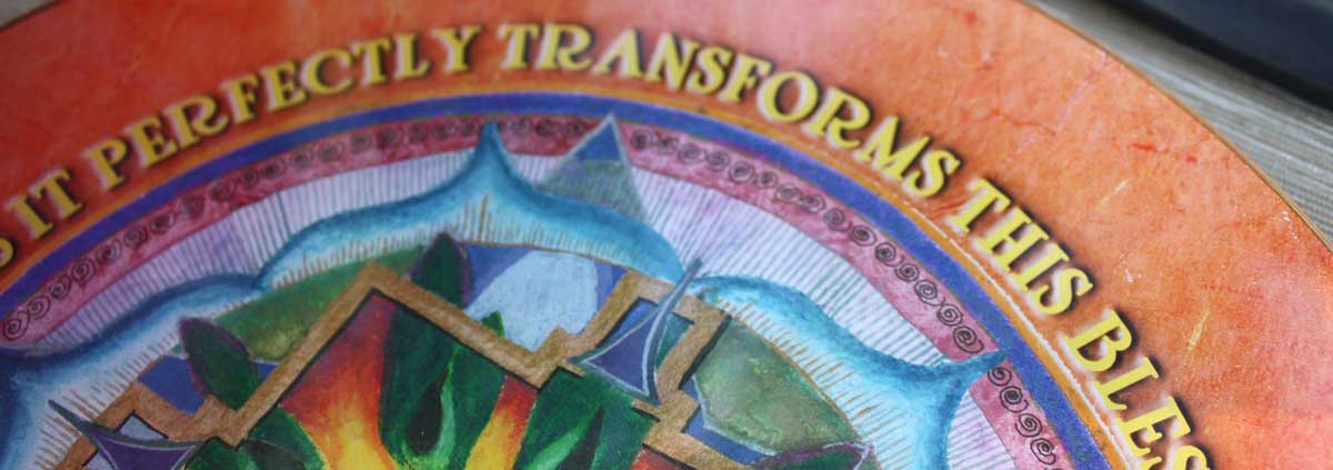 These stunning art glass plates are made from a print of an original watercolor mandala by Jo Thomas Blaine. The print is fixed to the back of the plate using a non-toxic polymer resin, appearing to be virtually fused with the glass. When handled with care, the plates are fully usable. Simply hand wash, towel dry and avoid soaking. If the plate is wet for too long, the backing changes to opaque white, which will turn clear again when allowed to dry. A few minutes in the sun works like a charm (but only a few… prolonged exposure to the sun should be avoided, as the sun fades the colors of almost everything.) The glass plates are available inĀ 14″ platters, 10″& 9″ plates and 8″ bowls.